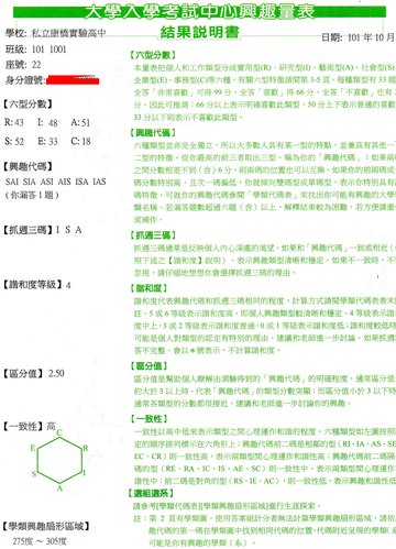 同學們在高一不久,學校幫同學作的性向測試,目的在幫助同學了解自己興趣選擇適合自己的大學科系