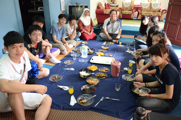 最特別的是去參訪馬來家庭與他們一起共進午餐,並體驗他們的服裝。屋主非常親切的準備了一堆好吃的食物與飲料和點心,我們跟著當地的文化用手抓飯來吃,不過還是習慣用餐具就是了,之後還玩了彈珠的小遊戲。最後我們回到廣場和他們一起玩民族遊戲,打鼓、教音樂、自己動手作風箏、晚上享用他們的烤肉和一串串的沙嗲,並同時欣賞他們的民族傳統舞蹈。今天真的收穫很多,和馬來人相處的很愉快,學習到很多他們的習俗,是很棒的回憶。