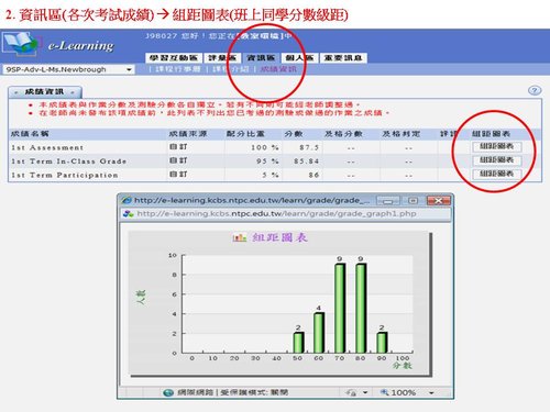 2. 資訊區(各次考試成績) à 組距圖表(班上同學分數級距)